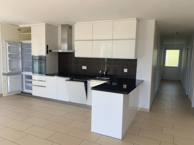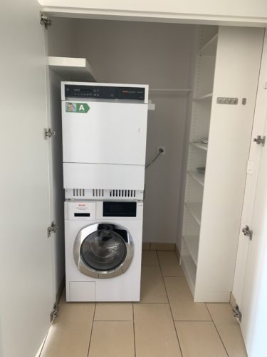 - Hall d’entrée/corridor de distribution avec armoire encastrée équipée d’une colonne de lavage et interphone