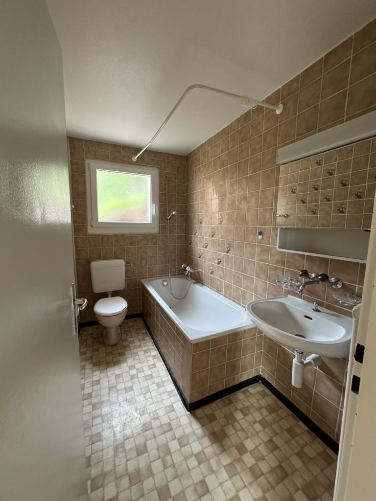 - Salle d’eau avec baignoire, lavabo, WC et fenêtre